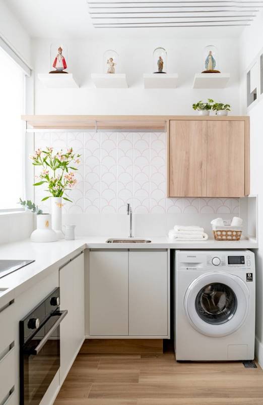 Como são fáceis de limpar, tornam o dia a dia mais prático, sendo necessário apenas um pano úmido para remover qualquer sujeira acumulada. Azulejos na lavanderia criam uma base visual organizada e podem destacar áreas específicas, como a bancada, a parede atrás da máquina de lavar ou a região do tanque.